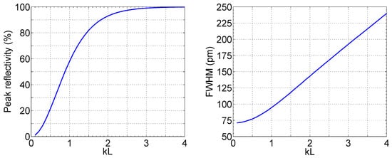 Peak reflectivity (left) and FWHM (right) for a uniform FBG as a function of the grating strength coefficient kL. Parameters: L = 1 cm, neff = 1.5, δneff = 10−6, λB = 1550 nm.