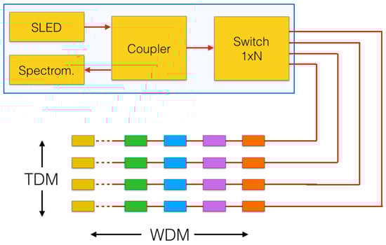 An FBG behaves as a narrow-band optical reflection filter [1,4,38], which reflects a narrow spectrum around the Bragg wavelength. Thus, it is possible to fabricate several FBGs in the same fiber, each for a different Bragg wavelength, and achieve an array format. FBGs can then discriminate in the optical spectrum domain, in a wavelength-division-multiplexing (WDM) configuration that allows interrogating up to 20–50 sensors in the same fiber [3,4,16,17,18,19,20,21]. In addition, thanks to micro-electromechanical systems (MEMS)-based optical switches [39], it is possible to obtain a multi-channel system, arranged in a time-division-multiplexing (TDM) format in which each FBG array is interrogated by changing the switch position. MEMS switches are available in 1 × 2 and 1 × 4 (the most popular format), up to 1 × 64. The combination of TDM and WDM allows the creation of FBG sensing networks of up to hundreds of sensors.