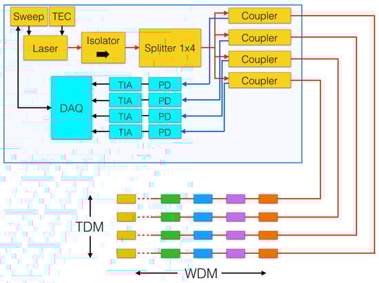 The main alternative to white-light setups is a scanning-laser based system, which is based on a narrow-linewidth laser that rapidly scans a wavelength range. This setup is shown in Figure 3, as industrialized in [36,37]. The light source is a low-power tunable laser, controlled in temperature by a thermo-electric controller (TEC) and in wavelength by a sweep-function generator, which is often implemented in the data acquisition (DAQ) hardware. The laser is followed by an isolator to filter out backreflections. A splitter 1 × N (typically 1 × 4 or 1 × 8) is used for multiplexing into multiple channels. Couplers are then used to route light to each FBG array and pack to a photodetector (PD), followed by a transimpedance amplifier (TIA), to obtain the output. The DAQ maintains the synchronization between the sweep-function generator and the array of photodetectors. The main advantage of this setup is the wavelength resolution, as 5–10 pm resolution over up to 100 nm can be obtained [36]. However, the system has an inferior SNR and long-term wavelength stability, due to the use of a laser source.