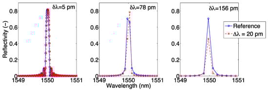 FBG spectra reported in reference condition and for a wavelength shift Δλ = 20 pm, obtained for different values of wavelength resolution δλ = 5 pm (left), δλ = 78 pm (center), δλ = 156 pm (right).