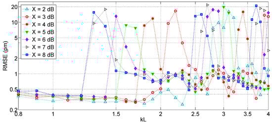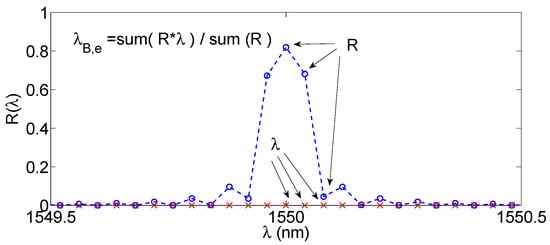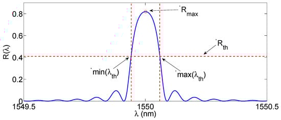 The first operation is to set a threshold Rth, having spectral amplitude X dB below the maximum measured reflectivity Rmax. Then, the set of wavelengths λth is calculated as the values for which the reflectivity exceeds Rth; so that they represent the inner bandwidth of the FBG. Finally, the Bragg wavelength is estimated as the center of the inner bandwidth. The value X is often set to 3 dB [48]: in this case the X-BW coincides with the evaluation of the center of the FWHM; however it is possible to adjust X in order to select a narrower or wider portion of the FBG. In the case of a perfectly symmetrical FBG spectrum, the estimated FBG wavelength coincides with the Bragg wavelength in Equations (1)–(3). In applications where the FBG spectrum is asymmetrical, the estimated wavelength is the center of the X-dB bandwidth and may differ from the Bragg wavelength. However, since the spectra shift without altering their shape, this bias does not alter the definition of Δλ.
