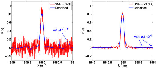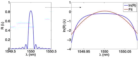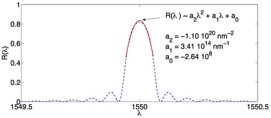which is the same result of Equation (12), because still related to a 2nd-order polynomial. Computationally, in this method the second-order regression is applied to the logarithm of the spectrum, implementing directly Equation (15) regardless of the relationship between (a2, a1, a0) and (A, σ, λ0), and then the Bragg wavelength is calculated from Equation (18).