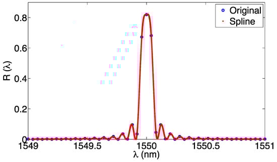 In a spline-based FBG tracking, the FBG spectrum is interpolated with a cubic spline on its grid with resolution δλ solving Equation (23) and obtaining the coefficients in Equation (21). Then, by means of Equation (22), it is possible to extend the approximation to all the inter-pixel points, as a matter of fact expanding the spectral estimate to all the values within each knot. The FBG peak is then computed by selecting the maximum value of the spline [40,42]; however, a better alternative is to search for the X-BW bandwidth within the spline-fitted function. The spline process is shown in Figure 9, where a simulated FBG simulated on a 40-pm wavelength grid is interpolated with a spline on a grid of 0.1 pm resolution.