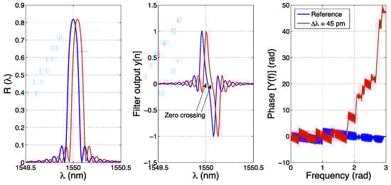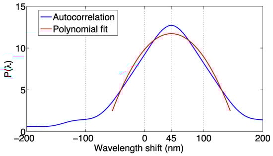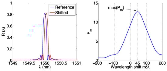 The process is illustrated in Figure 10. On the left, we consider the reference and measured spectra, the latter being a replica of the original pattern. The autocorrelation Pm has a shape that resembles the inner FBG spectrum, and the peak is located in correspondence of the estimated wavelength shift.