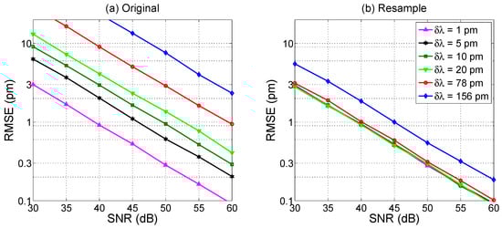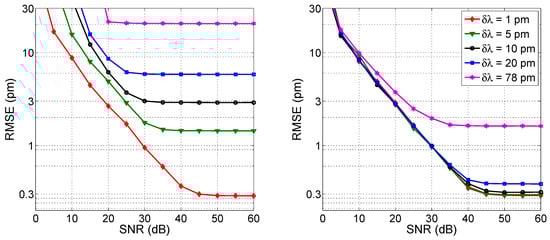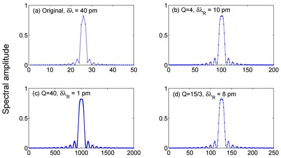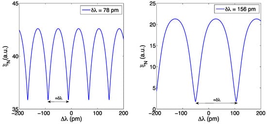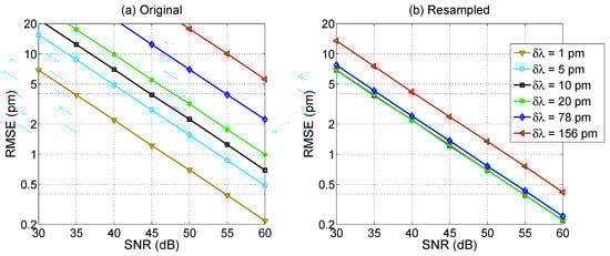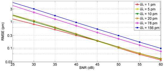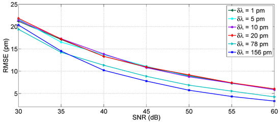 The effect of wavelength resolution is shown in Figure 4, where an FBG spectrum (in ideal noise-free conditions) is simulated using the CMT in Equations (1)–(3) under reference condition and with Δλ = 20 pm wavelength shift, for 3 different values of wavelength grid resolution δλ. For a narrow sampling (δλ = 5 pm) all the spectral details, including the side lobes [38], are visible in the FBG spectrum; extending the wavelength grid to a coarse resolution (δλ = 78–156 pm), the FBG appears as a small set of pixels (where we define pixel as the wavelength spacing between two adjacent wavelengths of the grid), and the spectrum appears to slightly change shape as a result of the under-sampling.