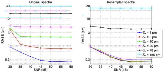 In the second part of the work, the several methods are compared in a simulation-based scenario, in order to analyze the performance. FBGs are simulated with Erdogan’s coupled-mode theory (CMT) [38], and a statistical analysis is used to evaluate the performance of all reviewed methods as a function of the wavelength resolution and signal-to-noise (SNR) ratio of the interrogation setup and on the grating strength coefficient [48]. This analysis allows comparing the different techniques in different working conditions, with the aim of optimizing each method and providing a guideline for their implementation.