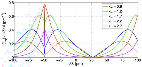 Figure 1 shows the relationship between the peak reflectivity and the FWHM, as a function of the grating strength coefficient kL, for a standard uniform FBG having Bragg wavelength 1550 nm. The peak reflectivity, which defines the amplitude of the spectral slice in correspondence to the Bragg wavelength, grows as tanh2 (kL) [38], saturating close to 100% for kL > 2.5. The FWHM exhibits an almost linear trend for reasonable values of kL > 1, up to kL = 4.