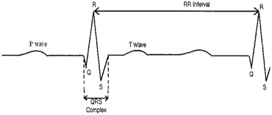 24]. The T wave represents the recovery phase. To calculate the heart rate, the position of the QRS complex and the RR interval (the RR interval is the time that elapses between two consecutive R waves) should be precisely specified.