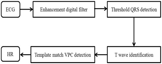 Figure 2. The detection is based on the combination of digital filtering to reduce the effect of noise, threshold QRS detection, a T-wave discriminating technique to distinguish the QRS complex from the T wave, and the template-matching method to distinguish the QRS complex from the ventricular premature contraction (VPC), because QRS and VPC waveforms are similar to those of a normal contraction.