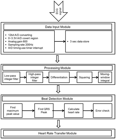 Figure 3 shows the algorithm for heart rate calculation. The ECG signal is converted into a digital signal by an analog-to-digital converter (ADC) with a sampling rate of 200 Hz. The 12-bit ADC stores data for a period of 3 s to find the maximum peak value. The digitalized signal is passed through the enhancement digital filter stage to reduce the effect of noise. The filter stage includes the following processing steps. The combination of low and high-pass filters creates an effective band-pass filter. The pass band extends up to the maximum energy of the QRS complex, which is approximately 5 to 15 Hz. Use of the integer coefficient, which reduces the operation of the microcontroller by a considerable amount, real-time filtering, and other calculations to identify the QRS can be implemented in a microcontroller (MSP430F149). The differentiation step provides the QRS complex slope information. After differentiation, the signal is passed through a squaring process to enhance the slope of the frequency-response curve as well as to reduce false positives caused by the T wave with highly abnormal energy. Finally, the moving-window integration process is used to obtain slope information and the width of the QRS complex. The width (number of samples) of the moving window is very important. It should be the same as the widest QRS complex in the ECG signal. If the window is too narrow, the integrated waveform can produce several peaks. On the other hand, if the window is too wide, the QRS and the T wave can be merged to form the integrated signal. These problems can make it difficult to detect the QRS complex in the next step.