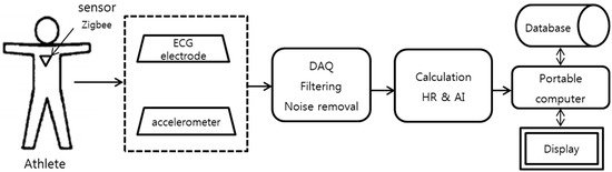 The overall data processing is summarized as follows. First, the bio-signals from the ECG and 3-axis accelerometer sensors are acquired. Further, the signals are processed by converting the analog signal to a digital signal with low-pass and high-pass filters. Subsequently, the signals are wirelessly transmitted in real time from the sensor node to the receiver. Finally, the embedded analysis software provides the interface that receives and displays the monitoring signal in a personal computer. The data can be saved by date and time. The athlete training data can be listed on the calendar from a portable computer. The coach can easily check the athlete’s daily training status. The schematic of the system is shown in