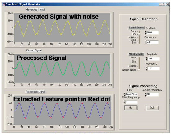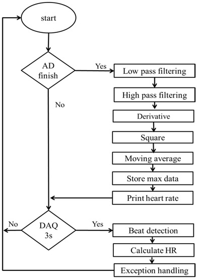 The heart rate algorithm is implemented on the sensor board using the monitoring signals from the ECG electrodes. The sample data are analyzed using eight channels. The channels cover the frequencies from 1 to 50 Hz. After conversion to digital signals, signal acquisition commences from the low-pass to the high-pass filter. The signals are divided by time slots to find the voltage peak for the RR interval. Based on beat detection, the heart rate can be calculated and output to the personal computer. The heart rate signal acquisition and processing are shown in