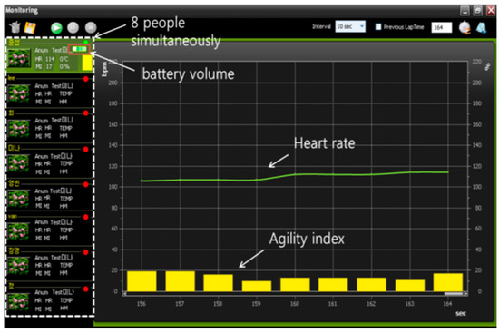 Figure 9 shows a screen shot of the monitoring interface. The system can simultaneously monitor eight people and save the training data by date. The display of the battery volume for each sensor can prevent interruption during the physical training. With the support of analysis software, a coach can observe both the heart rate and agility index simultaneously in real time or save athletes’ information for further off-line analysis and evaluation. The coach can also evaluate athletic potential with the embedded evaluation software.