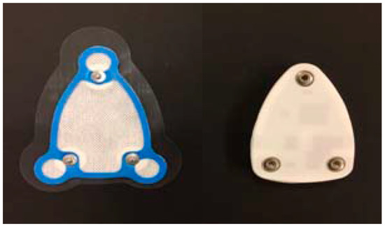 The sensor node comprises a triangular chip integrated with the ECG electrode, a ZigBee RF (Radio Frequency) communication module, a microcontroller, and a 3-axis accelerometer sensor. The top and bottom, packed with a battery and silicone-covered sensor node, are shown in