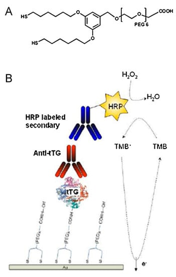 - Dulay, S.; Lozano-Sánchez, P.; Iwuoha, E.; Katakis, I.; O’Sullivan, C.K. Electrochemical detection of celiac disease-related anti-tissue transglutaminase antibodies using thiol based surface chemistry. Biosens. Bioelectron. 2011, 26, 3852–3856. [Google Scholar] [CrossRef] [PubMed]