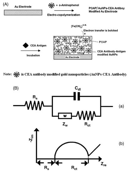 - Tang, H.; Chen, J.; Nie, L.; Kuang, Y.; Yao, S. A label-free electrochemical immunoassay for carcinoembryonic antigen (CEA) based on gold nanoparticles (AuNPs) and nonconductive polymer film. Biosens. Bioelectron. 2007, 22, 1061–1067. [Google Scholar] [CrossRef] [PubMed]