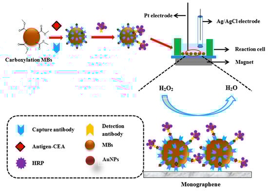 - Li, J.; Gao, H.; Chen, Z.; Wei, X.; Yang, C.F. An electrochemical immunosensor for carcinoembryonic antigen enhanced by self-assembled nanogold coatings on magnetic particles. Anal. Chim. Acta 2010, 665, 98–104. [Google Scholar] [CrossRef] [PubMed]