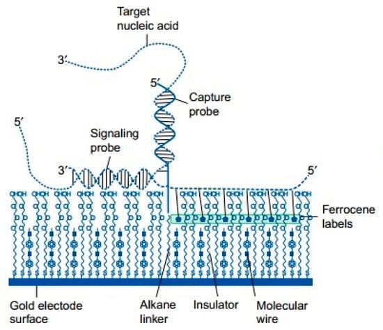 - Umek, R.M.; Lin, S.W.; Vielmetter, J.; Terbrueggen, R.H.; Irvine, B.; Yu, C.; Kayyem, J.F.; Yowanto, H.; Blackburn, G.F.; Farkas, D.H. Electronic detection of nucleic acids: A versatile platform for molecular diagnostics. J. Mol. Diagn. 2001, 3, 74–84. [Google Scholar] [CrossRef]