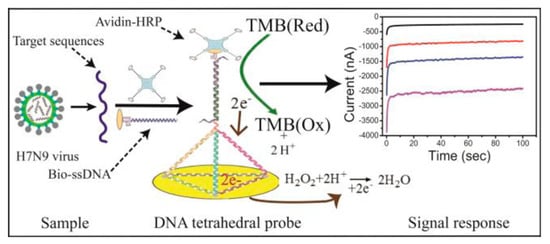 - Dong, S.; Zhao, R.; Zhu, J.; Lu, X.; Li, Y.; Qiu, S.; Jia, L.; Jiao, X.; Song, S.; Fan, C. Electrochemical DNA Biosensor Based on a Tetrahedral Nanostructure Probe for the Detection of Avian Influenza A (H7N9) Virus. ACS Appl. Mater. Interfaces 2015, 7, 8834–8842. [Google Scholar] [CrossRef] [PubMed]