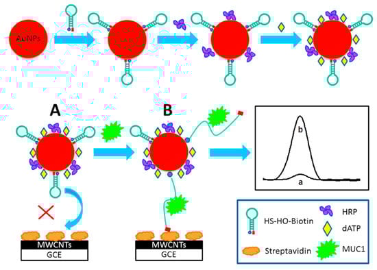 - Hu, R.; Wen, W.; Wang, Q.; Xiong, H.; Zhang, X.; Gu, H.; Wang, S. Novel electrochemical aptamer biosensor based on an enzyme-gold nanoparticle dual label for the ultrasensitive detection of epithelial tumour marker MUC1. Biosens. Bioelectron. 2014, 53, 384–389. [Google Scholar] [CrossRef] [PubMed]