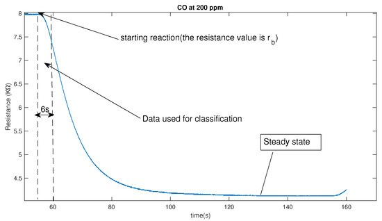 As there are 10 concentrations for each gas, for each type gas at each concentration, we make 25 repeated measurements and thus there are 250 measurements for each type gas. As there are 6 types in our case, totally we have samples in our data sets. It should be noted that the proposed algorithm can be directly applied to the raw data set and thus there is no need to do the preprocessing of the sampled raw data for the feature extraction. And, it is one advantage of the proposed algorithm, which can directly handle high-dimensional data without any feature extraction engineering. Besides that, we found that it only a small part of the time-sampled raw data is sufficient for the high-accuracy classification. In our case, we only use the first 6 s raw data since the reaction of the sensor started as shown in Figure 3. From the Figure 3 , at 200 ppm for gas , the gas sensor TGS2602 takes about 75 s to reach the steady state. Therefore, compared with existing method which use the sensor resistance at steady state as important features for the recognition, the proposed method can realize the recognition 12 time faster.