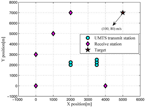 For numerical simulations, we assume a multistatic radar system with five UMTS-based transmit station and an equal number of receive stations, i.e., and . The Cartesian coordinates of the positions of transmit stations (in m) are given in Table 1. The positions and moving parameters of the receive stations are provided in Table 2. Consider a target moving with velocity is located at . For a brief discussion, we consider a scenario in a 2D geometry as visualized in Figure 1. In order to compare different radar systems based on the same amount of transmitted energy and signal bandwidth, it is assumed that all UMTS-based transmit stations considered in this section have single element transmitting arrays, i.e., . For the simulation parameters, we choose s, , , and the center frequency as in [31,32].