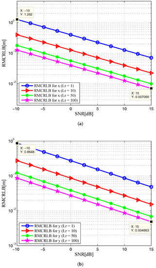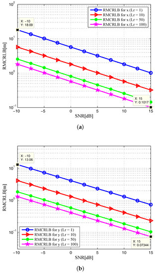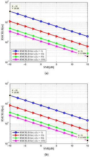 RMCRLB versus SNR in the target position dimensions with different when : (a) x-position; (b) y-position.