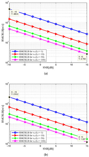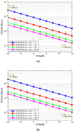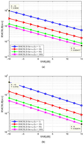 RMCRLB versus SNR in the target velocity dimensions with different when : (a) x-velocity; (b) y-velocity.
