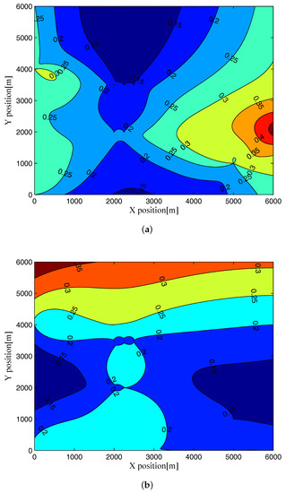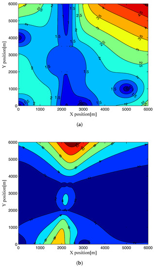 Now, to investigate the dependence of the RMCRLB values on the geometry between the target and the passive multistatic radar system, we illustrate the RMCRLBs for both target position and velocity in different position when and in Figure 4 and Figure 5 . From these figures, we see that the RMCRLBs on the Cartesian coordinates of target position and velocity are different when the target is located at different positions. That is to say, as the relative geometry between the target and the multistatic radar system changes by changing the target position, the RMCRLB values are changed, which is due to the fact that the geometry between the target and the multistatic radar system impacts the derivatives of the delay-Doppler terms with respect to the Cartesian coordinates remarkably [16,34]. This will open up a new dimension for passive multistatic radar systems by aiding the optimal placement of receive stations to improve the target parameter estimation accuracy.