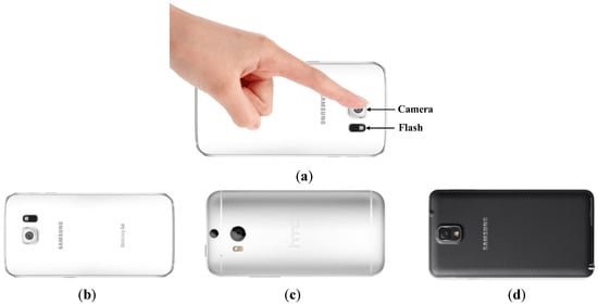 Smartphones used for evaluating performance: (a) General scheme to acquire videos from three devices; (b) Samsung Galaxy S6; (c) HTC One M8; (d) Samsung Galaxy Note 3.