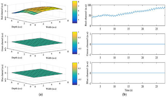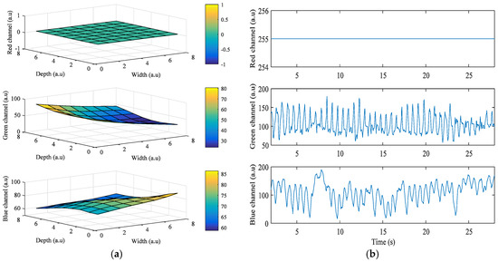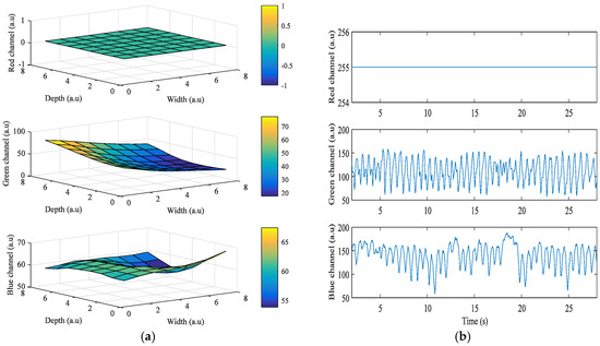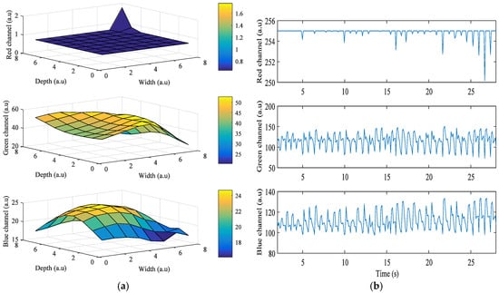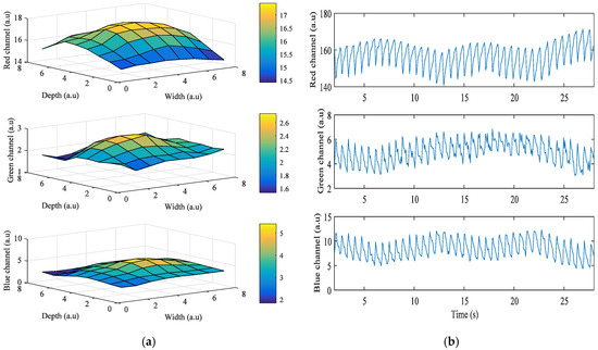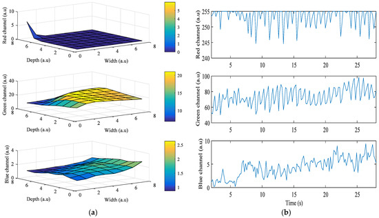 We investigated the signal quality among the red, green, and blue color bands for each pixel region for all three devices. Figure 2a shows the results obtained from the Galaxy S6 using a grid size of 8 × 8. In the figure, the x-axis and y-axis are depicted in grid scale to improve visualization of the intensity (z-axis) of the images when the flashlight was on. Even though the LED flash is placed on the right of the camera, Android device’s orientation is set to landscape mode while acquiring signals. In this case, the right side of the portrait mode ROI is turned to be on top, and the left side is on the bottom. As the ROIs get closer to the flashlight, of the green and blue color bands gets higher. However, in Figure 2a, of the red color band in the ROIs is 0 when close to the flashlight because the intensity values are always 255, which is the maximum value of intensity. Figure 2b shows the intensity of the three color bands over time when the flashlight was on. In the figure, the average values of of the red, green, and blue color bands are 0, 38.7, and 26.59, respectively. We found that the green color consistently provided significantly higher mean amplitude values than either the blue or the red color. We also found that the region closest to the flash in most cases resulted in a higher signal quality, which is logical and expected.