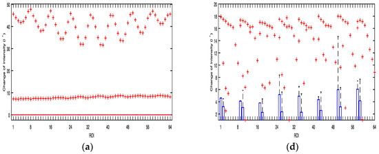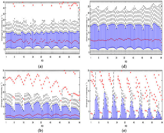 Figure 5 shows boxplots with the median calculated by the average values of of the three color bands obtained from the 64 ROIs of the Galaxy S6 when the flashlight was on. The lower boundary of the box indicates the 25th percentile, a line within the box marks the median, and the upper boundary of the box indicates the 75th percentile. Whiskers (error bars) above and below the box indicate the 90th and 10th percentiles. Therefore, the area of the blue box is an indication of the spread. Red crosses represent the outliers. In the case of the Galaxy S6, harmonics of green and blue color bands provide a stronger PPG signal than the others while most ROIs of a red color band have low values. In the case of the Galaxy Note 3, 1–3 or 6–8 ROIs and their harmonics of all color bands provide strong PPG signals. The average values of were found to be highest in blue and green color bands as shown in Table 2.