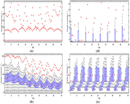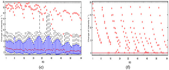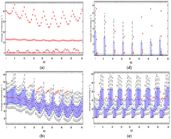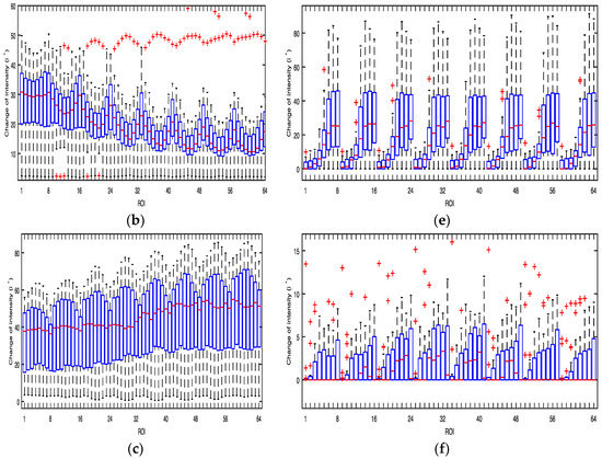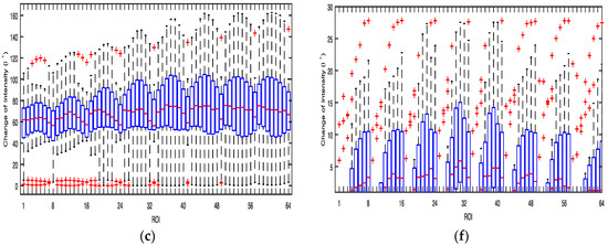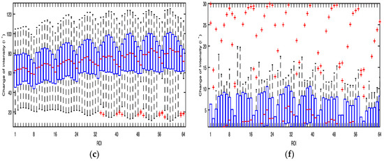 Box plot of the average values of of the three color bands obtained from the 64 ROIs of the Galaxy S6 and the Galaxy Note 3 from 30 subjects while shaking the cushion horizontally: (a) Red (Galaxy S6); (b) Green (Galaxy S6); (c) Blue (Galaxy S6); (d) Red (Galaxy Note 3); (e) Green (Galaxy Note 3); (f) Blue (Galaxy Note 3).