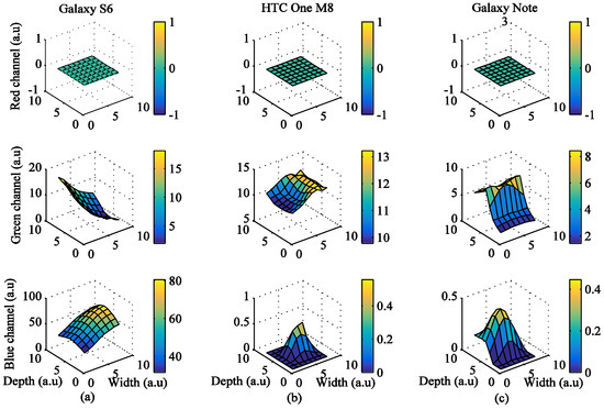 When the LED flash is off, a change of intensity of the signals of the three color bands was observed in most smartphone models except the Galaxy Note 3. This change of intensity depended on the type of smartphone. Figure 12, Figure 13 and Figure 14 show the results obtained from all smartphones when the flashlight was off. From the figures, the change of intensity was observed mainly in the center of images. In the case of the Galaxy S6, the intensities in the signals of all of the color bands were strongly detected without the flashlight of the smartphone. In the case of the HTC One M8, the heart rate can be measured only from the signals of the green or red color band while the heart rate can be measured from only the signals of the red color band in the case of Galaxy Note 3.
