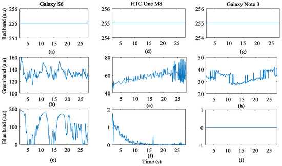PPG signals with a fingertip pressure force: (a) Signal of the red color band of Galaxy S6; (b) Signal of the green color band of Galaxy S6; (c) Signal of the blue color band of Galaxy S6; (d) Signal of the red color band of HTC One M8; (e) Signal of the green color band of HTC One M8; (f) Signal of the blue color band of HTC One M8; (g) Signal of the red color band of Galaxy Note 3; (h) Signal of the green color band of Galaxy Note 3; (i) Signal of the blue color band of Galaxy Note 3.