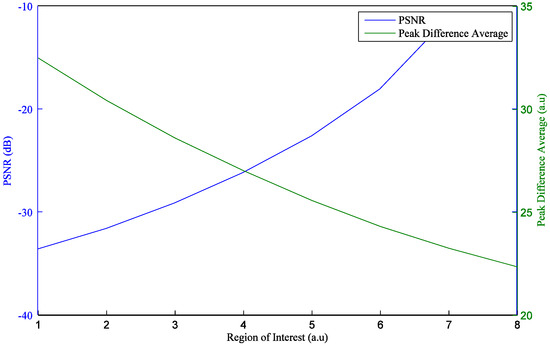 When acquiring PPG signals from a smartphone camera, instead of a series of full-size images, this downsized image, namely, the ROI, requires less computational resources and produces more reliable PPG signals [13,14]. Proper selection of the ROI is one of important steps to collect reliable signals. There are two significant advantages to employing an optimized ROI. One is that the computing load is decreased by reducing the image size used to extract the PPG signal. The other is that stronger and more robust PPG signals are obtained by removing the noisy regions. In the experiments, the PPG signal of full-size images was compared with that of ROIs. The ROIs were selected by the optimal ROI determination method [15], which recursively splits regions to locate the region that produces the strongest PPG signal. Figure 16 shows the intensity changes of the full-size images and selected ROIs obtained from the Galaxy S6. When the PPG signals of the full-size images and the selected ROIs were obtained, average values of were 22.36 and 32.49, respectively. In other words, of the selected ROIs is 45.3% higher than that of full-size images. Figure 17 shows and the peak signal-to-noise ratio (PSNR). In the figure, the wider the ROI, the lower gets. The wider the ROI, the higher the PSNR gets. In other words, while intensity of the selected ROIs is stronger than that of full-size images, PPG signals obtained from the selected ROIs can be more affected by motion artifacts.