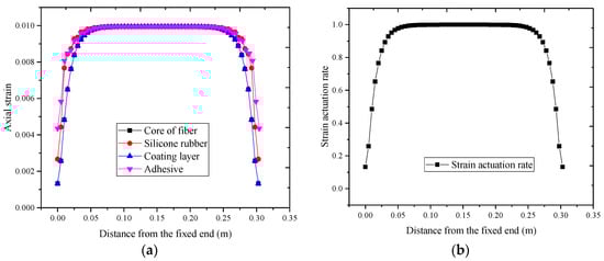 Axial strain located at the symmetry surface of each layer is shown in Figure 6a. As shown in Figure 5 that the axial strain of each layer is non-uniform along the bonded length. Due to the strain concentration of each layer at the bonded end region, the strain of each layer rapidly decreases with increasing distance between the bonded end region and the mid-beam region. Additionally, the strain of each layer at the mid-beam region is approximately equal. As shown in Figure 6b, the actuation rate of the optical fiber gradually increases from the bonded end region to the mid-beam region of the bonded length, and it is close to 1 at the mid-beam region.