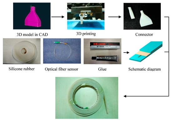 The fabricating process of the DOFS with the encapsulation structure includes the following six steps (Figure 7): (1) Two connectors are designed by CAD software and manufactured by a 3D printer. (2) After cleaning and drying, a positioning line in the middle of the rubber strip is drawn. (3) The components are combined together, as shown in Figure 8. (4) The optical fiber is temporarily fixed using instant adhesive. (5) Special silicone adhesive named JUKAM-988A, produced by Dongguan Jingshun compound material Co., Ltd. (Dongguan, China), has been used to paste two pieces of silicone rubber together. (6) It takes 24 h for the adhesive to dry. After that, the DOFS with the encapsulation structure needs to be placed in an oven at 70 °C for 6 h.