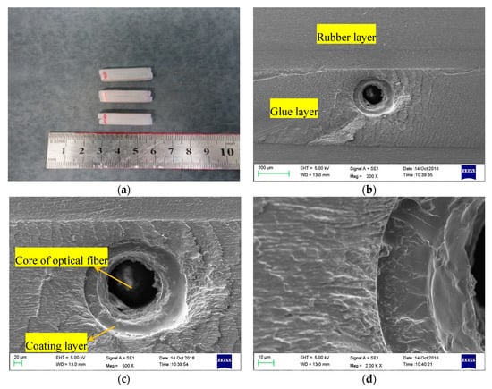In order to observe the interface contact of the encapsulation structure, three sliced specimens of DOFS with rubber encapsulation structures have been prepared and observed with a scanning electron microscope (ZEISS EVO18, ZEISS Co., Oberkochen, Germany) at different standardized magnifications (200×, 500×, and 2000×).