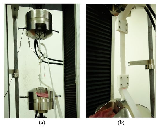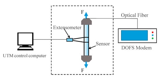 During the process of optical fiber sensing test, a 5 m long sensor is fabricated and tested. Five test sections are chosen evenly along the sensor. The tensile sensing test was carried out with a Jinan Koohei Test Machine Co., Ltd. (Jinan, China) WDW-200D universal test machine (UTM). The displacement measurement accuracy is ±1% with a displacement resolution up to 0.05 mm. An extensometer is used to measure the tensile strain of the sensor. The schematic illustration of the tensile sensing test is shown in Figure 10, and the test is shown in Figure 11.