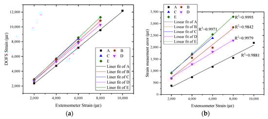 As shown in Figure 12b, the strain measurement error gradually increases with the increase of the measured value of the extensometer. The strong correlation between strain measurement error and measured value of the extensometer of different test section shows that the unstable connection between the extensometer and test sections of optical fiber sensors will cause strain measurement errors.
