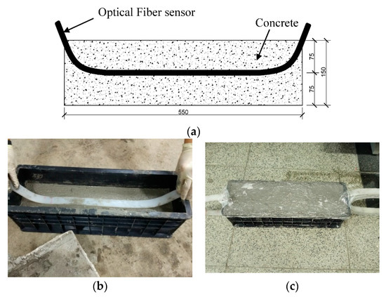 In this test, a cement concrete column was made, the size of the column is 550 mm × 150 mm × 150 mm. The optical fiber sensor is placed in the center of the column, as shown in Figure 13. The concrete mix ratio is shown in Table 1.