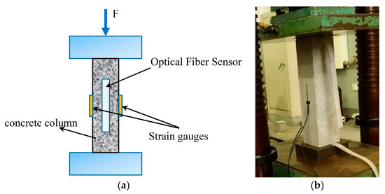 (a) Schematic illustration of the compression test; and (b) the concrete column under testing.