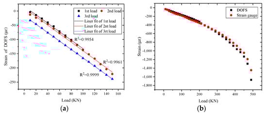 As shown in Figure 12a, the strain measurement data from different test sections of the optical fiber sensor shows great linearity, the of each linear fit function is greater than 0.99.