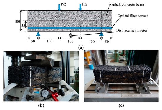 Four-point bending test of an asphalt concrete beam. (a) Schematic illustration of the asphalt concrete beam (mm); (b) testing process; (c) asphalt concrete beam after bending test.