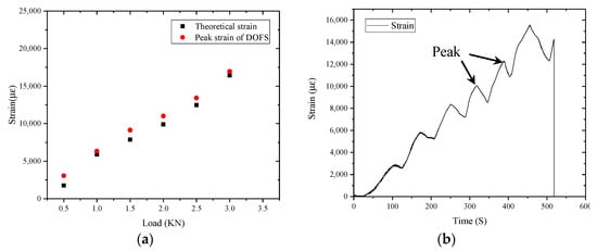 As shown in Figure 18a, the strain of the mid-beam region of the beam gradually increase with load increase. The pack strain measured by DOFS is always larger than the theoretical strain based on bending deflections measured by the displacement meter and calculated by Equation (3). The reason is, in the measuring process of the displacement meter, the load of the universal testing machine should be kept constant. During this process, the strain of the beam continuously increased due to the creep properties of the asphalt concrete.