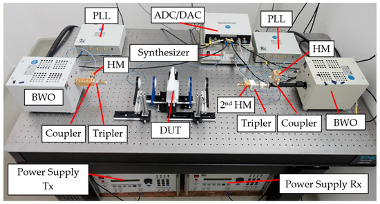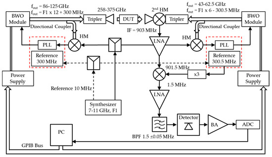 The THz spectrometer is constructed with BWOs. The output power of a BWO is coupled through a frequency tripler, and the output of the tripler is transmitted through the sample or lens system via a horn antenna. The transmitted signal is detected by a second harmonic mixer (HM; Virginia Diodes, Inc., Charlottesville, VA, USA), which is the most sensitive detection method because of the low noise floor of the detector (<10–15 NEP). The disadvantage of the second HM is that an additional BWO and tripler are needed to drive the reference input of the mixer with a synchronous frequency input (Figure 2 and Figure 3). In our case, a synchronous frequency offset enabled the generation of an AC-coupled output signal without 1/f noise. This setup measures from 258 GHz to 375 GHz, and we used 0.03 GHz increments for the spectral resolution.