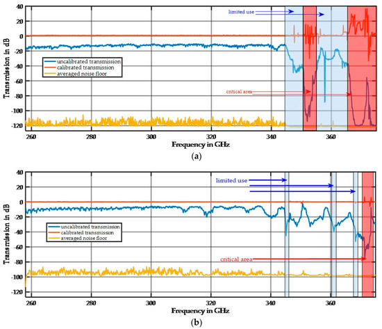 (a) Plot showing the spectral behavior of setup 1 without a sample. The blue regions indicate frequency ranges with limitations; these ranges can only be used with adequate signal amplitudes. The red regions have highly restricted use; (b) Plot showing the spectral behavior of setup 2 without a sample.