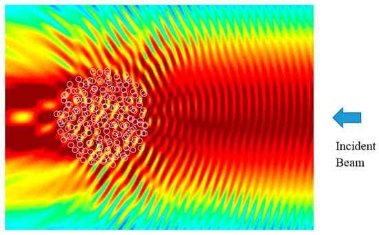 Scattering behavior of 500 arbitrarily arranged spheres. The color gradient shows the local intensity. Simulation result of Celes software [32] (Karlsruher Institut fürTechnologie, Karlsruhe, Germany). The incident beam originates from the right side.