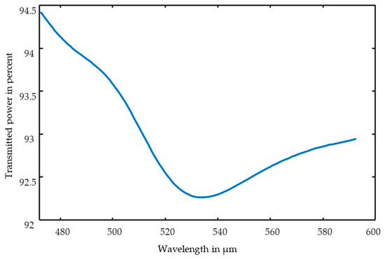 The plot in Figure 6 demonstrates that the transmitted intensity highly depends on the geometric arrangement of the spheres. Therefore, a high dependence on the local measurement point is expected for this measurement. Additionally, the transmitted intensity changes with the wavelength, as shown in Figure 7.